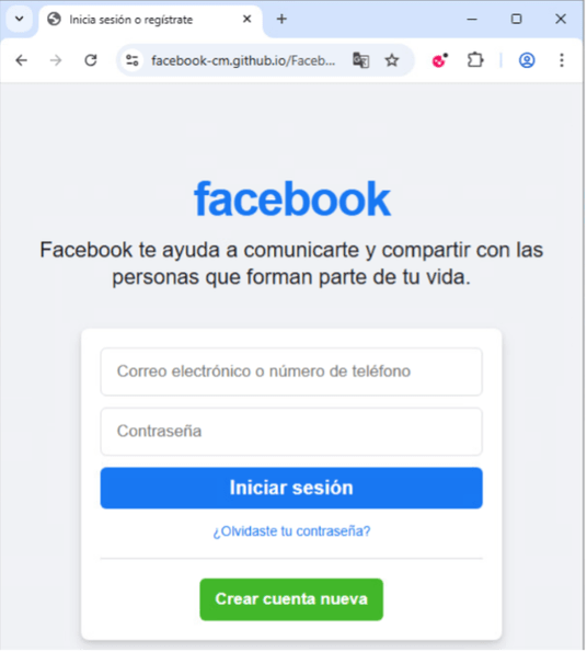 2025年第4四半期、CPRはFacebookに関連したフィッシングページを用いる別の攻撃を発見しました。このページはfacebook-cm[.]github[.]ioでホストされ、メールで送信されます。Facebookのログインポータルを模倣しており、見慣れたブランド要素とレイアウト、認証入力を求めるメッセージが配され、表示はすべてスペイン語が使用されていました。ユーザーはメールアドレス、電話番号、パスワードの入力を求められ、攻撃者はそれらを収集してアカウントへの不正アクセスが可能になるほか、潜在的な2次悪用の可能性もあります。