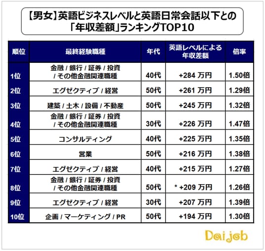 【Daijob.com独自調査】AI浸透でも「英語力」がキャリアに強い武器に~50代女性で最大1.9倍(+319万円)の年収差、金融関連職の40代は1.5倍(+284万円)の年収差が明らかに~