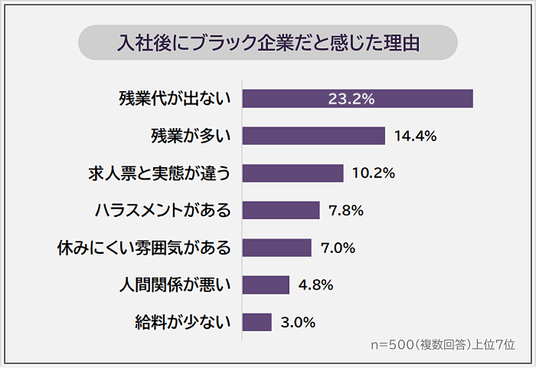 入社後にブラック企業だと感じた理由の1位は「残業代が出ない(23.2%)」でした。2位「残業が多い(14.4%)」、3位「求人票と実態が違う(10.2%)」が続きます。