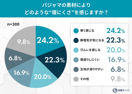 - 寝にくさの内容は「寒く感じる」「静電気が気になる」「汗ムレ」が中心