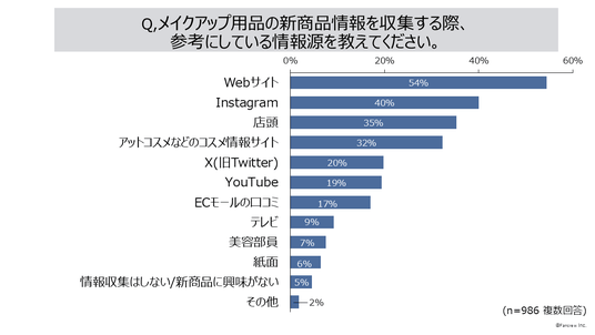 2.メイクアップ用品の新商品情報を収集する際に参考にしているのは「Webサイト」54%、「Instagram」40%