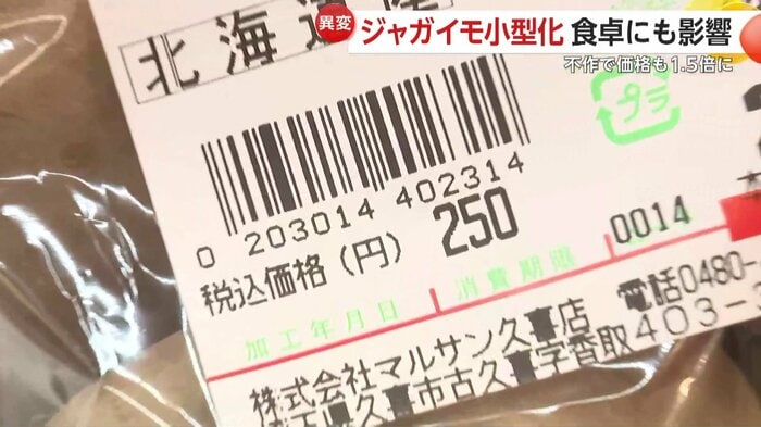 小ぶりのジャガイモが7個ほど入った1袋当たりの価格は約250円。1年前に比べ、1.5倍ほどの値上がりになっているという。