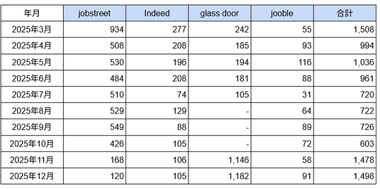 主要4サイト別の掲載数としては、「jobstreet」が120件、「Indeed」が106件、「glass door」が1,182件、「jooble」が91件となり、複数の求人サイトで1,498件の求人募集となりました。