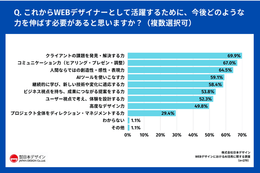 「Q.これからWEBデザイナーとして活躍するために、今後どのような力を伸ばす必要があると思いますか?(複数選択可)」(n=279)と質問したところ、「クライアントの課題を発見・解決する力」が69.9%で最多となりました。
