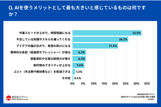 AIの最大メリットとしては「作業スピード・時短」(32.5%)が1位となり、効率化ツールとしての価値が最も評価されています。