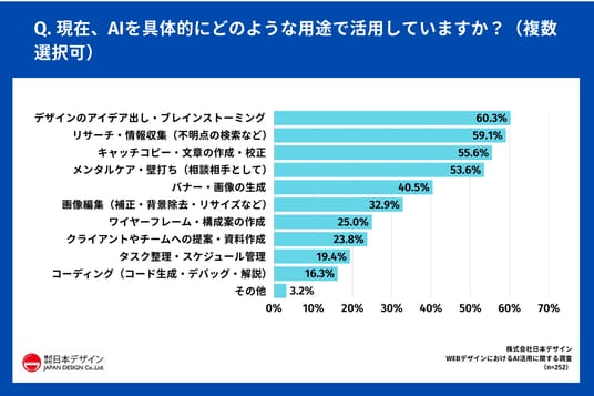 「Q.現在、AIを具体的にどのような用途で活用していますか?(複数選択可)」(n=252)と質問したところ、「デザインのアイデア出し・ブレインストーミング」が60.3%で最多となりました。