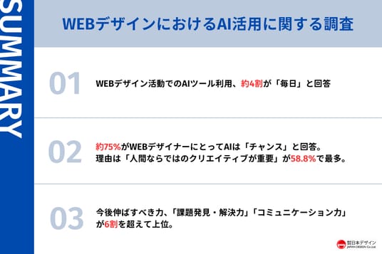以上の結果から、WEBデザイン関係者の多くはAIの進化を前向きに捉えており、AIを活用しながら「人間ならではの価値」を高めていく姿勢が主流となっていることが示されました。