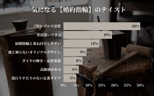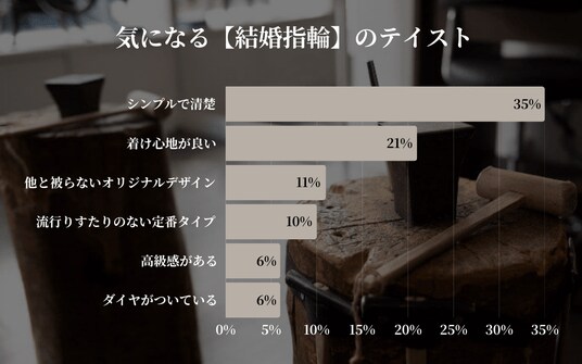 「シンプルで清楚(35.0%)」と「着け心地が良い(21.0%)」が2大巨頭となり、全体の56%を占めました。毎日24時間身に着けるものだからこそ、装飾よりも「指への馴染みやすさ」や「飽きのこなさ」が重要視されています。一方で「他と被らない(11.0%)」ニーズも根強く、シンプルな中にも手作りならではの「自分たちだけの証」を刻もうとする傾向が定着しました。
