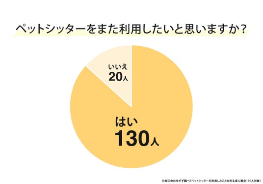 ペットシッターの利用経験者150人に、「ペットシッターをまた利用したいと思いますか?」と尋ねたところ、「はい」130人、「いいえ」20人となり、利用経験者の約9割が再利用意向を示しました。
