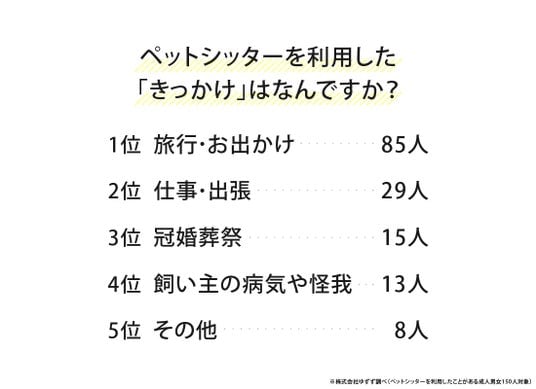 ペットシッターを利用したきっかけを尋ねたところ、1位は「旅行・お出かけ」85人でした。続いて「仕事・出張」29人、「冠婚葬祭」15人、「飼い主の病気や怪我」13人となりました。