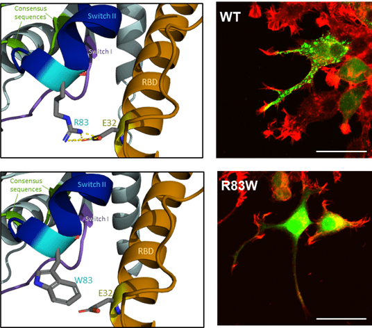AlphaFold3*9による構造モデル解析では、野生型*10 Rab3AのArg83は RIM1 のGlu32と静電的相互作用を介して結合しており、この相互作用がR83W変異で破綻することが示唆されました(図3左)。