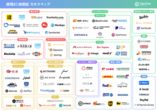 そこでZenGroupは、越境EC関連サービスをカテゴリー別に分類した「越境ECカオスマップ」を制作しました。業界における多様なサービスを整理し、全体像を把握しやすい形でまとめています。