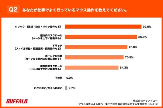 「Q2. あなたが仕事でよく行っているマウス操作を教えてください。(複数回答)」(n=112)と質問したところ、