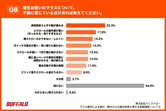 「Q8. 現在お使いのマウスについて、不満に感じている点があれば教えてください。(複数回答)」(n=112)と質問したところ、