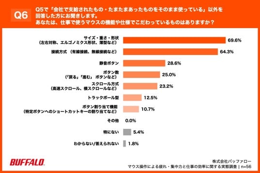 あなたは、仕事で使うマウスの機能や仕様でこだわっているものはありますか?(複数回答)」(n=56)と質問したところ、
