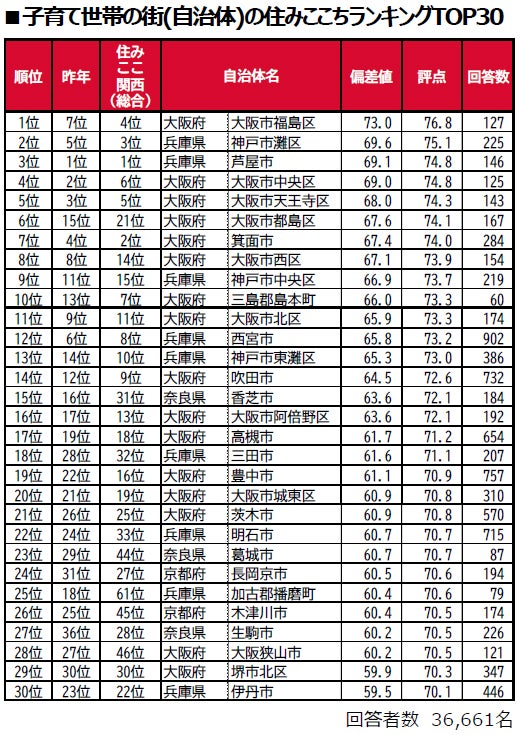 子育て世帯の街(自治体)の住みここちランキング2025<関西版>1~50位