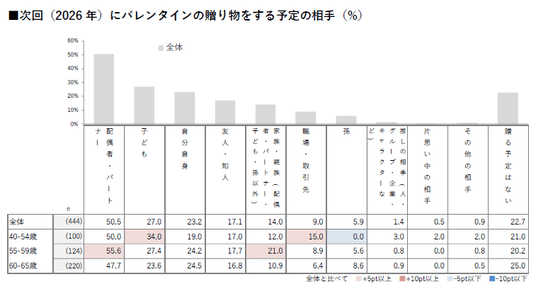 - 自由回答結果からも、かつて一般的だった ”職場の義理チョコ文化” は大きく縮小し、贈る相手も身近な家族や自分へと絞られている傾向が見られた。