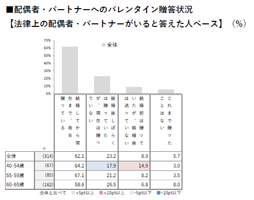 - 法律上の配偶者・パートナーがいる女性に対し結婚後のバレンタインについて尋ねたところ、「夫・パートナーへの贈り物を、結婚してから現在まで毎年贈っている」と回答した人は62.1%と過半数を占めた。