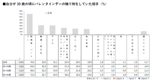 全国の40~65歳女性に「自分が30歳の頃にバレンタインデーの贈り物をしていた相手」と「次回(2026年)にバレンタインの贈り物をする予定の相手」について尋ねたところ、「職場・取引先」と回答した人は32%から9%へと数字が大きく減少した。