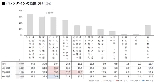 ■55~59歳では「自分へのご褒美として楽しむもの(32.3%)」「その時期限定販売の商品を買って楽しむもの(22.6%)」が他の世代より高く、バレンタインを“自分のためのイベント”として捉える傾向が見られた