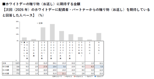 ■5割以上が「ホワイトデーの贈り物(お返し)を期待していない」と回答。配偶者・パートナーからの贈り物(お返し)に期待する金額は若年層ほど低く、いわゆる "倍返し" への期待は薄れつつある
