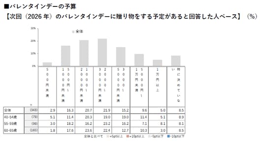- バレンタインデーの贈り物の予算は「2,000~3,000円未満(21.9%)」が最多。