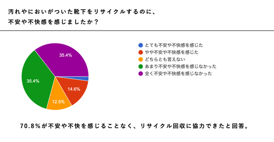 本プロジェクトでは、ケミカルリサイクルの回収において「割にあわない」「面倒くさい」「次の人に使われることに抵抗がある」「他人に見られたくない」などの消費者の心理的な課題があると仮定し、課題解決に向けて施策を設定しました。それらの効果を検証するため、靴下回収後、プロジェクト参加者を対象に個別アンケート調査を実施しました。その結果、汚れやにおいのついた靴下でもリサイクル回収において「不安や不快感を感じなかった」と回答した参加者が 70.8%に達し、回収に対する心理的な負荷が低いことが分かりました。さらに 70.8%の参加者が、「回収に手間を(あまり)感じなかった」と回答しました。
