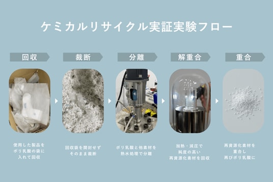 ケミカルリサイクルのプロセス検証は、ラボスケールからパイロットスケールまで段階的に実施。ラボスケールで最適条件を導き出したうえでパイロットスケールで検証した結果、いずれの段階においても高純度・高品質な再資源化素材(モノマー)が得られることを確認しました。さらに、その再資源化素材を用いて製造した PLA 樹脂は、通常品と同等の性能を示し、再利用が可能であることが実証されました。