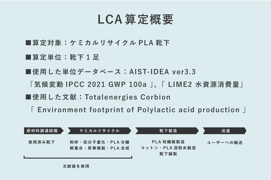 本実証実験では、汚れなどが付着した使用済み靴下であっても、ケミカルリサイクルにより原料であるポリ乳酸へ再生できるかを検証しました。なお、本実証は靴下などの製品化までを行うものではなく、原料であるポリ乳酸の生成までを検証対象としています。