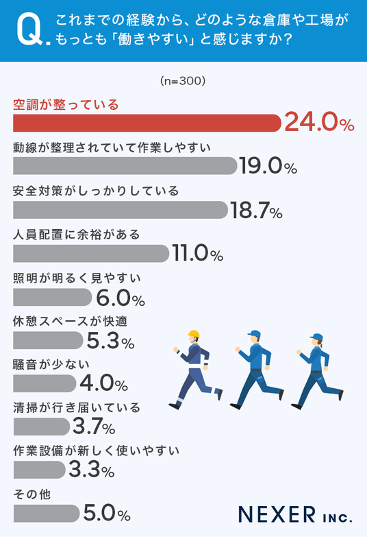 その結果、もっとも多かった回答は「空調が整っている」で24.0%でした。次いで「動線が整理されていて作業しやすい」が19.0%、「安全対策がしっかりしている」が18.7%と続いています。