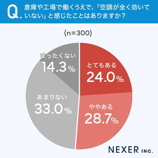 最後に、倉庫や工場で働くなかで「空調が全く効いていない」と感じた経験があるか調査しました。