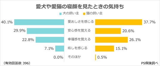 また、「安心感を覚える」(20.6%)や「癒しを感じる」(15.1%)も挙げられ、愛猫の寝顔が飼い主の心を穏やかにしている様子がうかがえます。犬の飼い主より「癒しを感じる」を挙げる割合がやや高く、静かな寝顔が飼い主に落ち着きをもたらしていると考えられます。