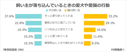 ・「そっと寄り添ってくれる」(犬の飼い主:37.6%、猫の飼い主:33.2%)。