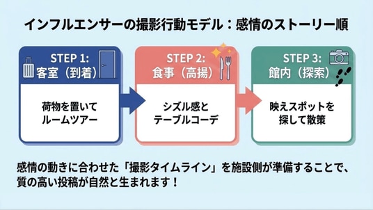 投稿を自然に生み出してもらうためには、「どこを撮るか」というスポットだけでなく、「客室(到着の感動)から食事(高揚感)、そして館内へ」という、感情が動くストーリーに沿った撮影のしやすさが実はとても大切なのです。