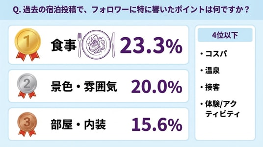 宿でフォロワーに最も響いた要素は、「食事」23.3%が1位。次いで「景色・雰囲気」20.0%、「部屋・内装」15.6%でした。実際の声でも「朝食の豪華さ」や「窓から見える風景がとても綺麗で響いた」といった反応が多く、さらに「部屋の中にかなり大きなプールがある他にはないホテルだった」のように、“その宿ならでは”の一点突破が強い印象を残すケースも見られました。つまり「共感されるフォトジェニック」の正体は、食(感情)×景色(非日常)×部屋(体験の中心)の3要素に分解できると考えられます。