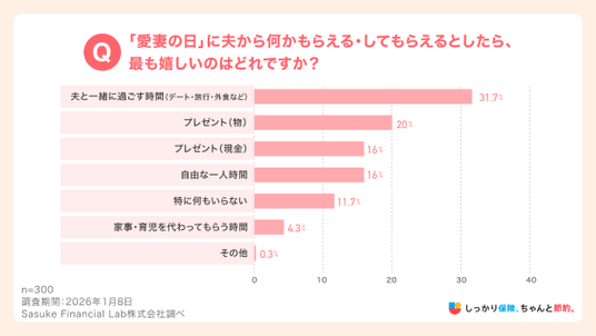 Sasuke Financial Lab株式会社(本社:東京都千代田区、代表取締役:松井 清隆)が運営する、保険比較・FPに無料相談できる総合保険サイト「しっかり保険、ちゃんと節約。(https://www.navinavi-hoken.com/)」において、1月31日の「愛妻の日」を前に、夫からの贈り物について、20代以上の既婚女性300名を対象に意識調査を実施し、公開しました。