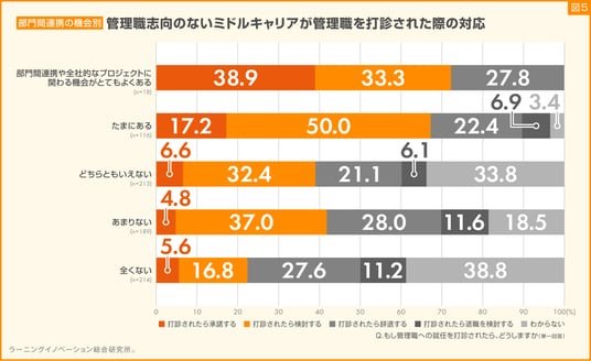 部門間連携や全社的なプロジェクトに関わる機会があるミドルキャリアは、そうした機会がないミドルキャリアよりも「承諾」する割合が高いことがわかりました(図5)。