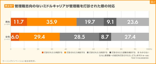 2.男性は女性に比べて、管理職を打診されたら「承諾」「検討」の割合が高い