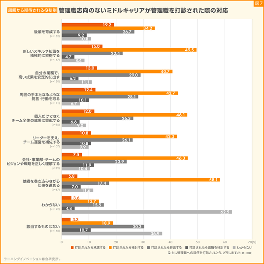 現在の自身の立場で、周囲から期待されていると思う役割について質問し、回答項目別に管理職就任を打診された際の対応について分析しました。