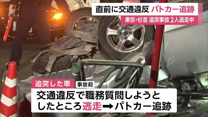 東京・杉並区で、車が追突事故を起こし運転手ら2人が逃走した事件で、この車が交通違反をしてパトカーの追跡を受けていたことが分かりました。