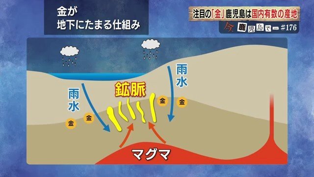 金が地下にたまるメカニズムはこうだ。地下にしみこむ雨水がマグマに近づくにつれて岩石に含まれる金も溶け込み、その金を含んだ水がマグマの熱によって岩石の割れ目を通って上昇する。地表に近づく際に溶けていた金がたまり、鉱脈という金がちりばめられた帯状の塊ができる。活火山の多い鹿児島は、まさに大地の恵みとして金を育んできたのだ。