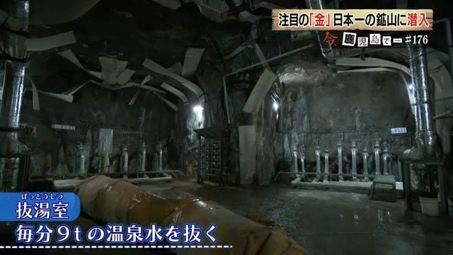坑道の入り口から約15分進むと、最も深い場所で温泉が湧き出ているのを確認。この場所は「抜湯室」と呼ばれ、毎分9トンもの温泉水を抜く作業が行われている。菱刈鉱山ではマグマで温められた雨水が温泉として沸き続けているのだ。