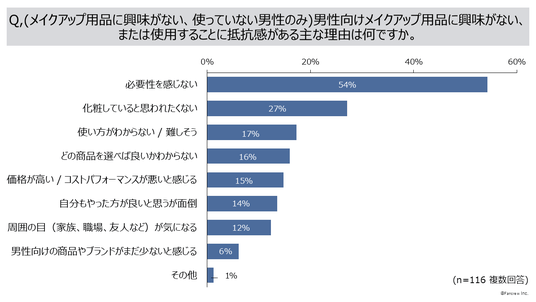 2.(「メイクアップ用品に興味がない、現在使っていない」と回答した男性のみ)メイクアップ用品に興味がない、または現在使っていない理由は「必要性を感じない」54%、「化粧していると思われたくない」27%