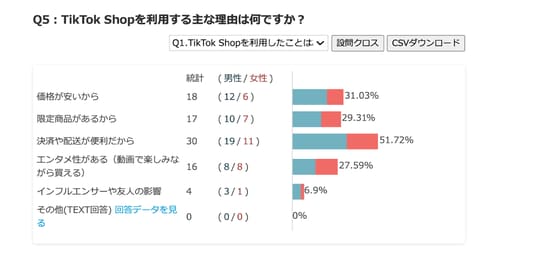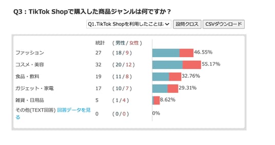 特に、ファッション・コスメともに男性の購入比率がやや高く、オンラインで気軽に買えるTikTok Shopの利点が作用していると考えられます。