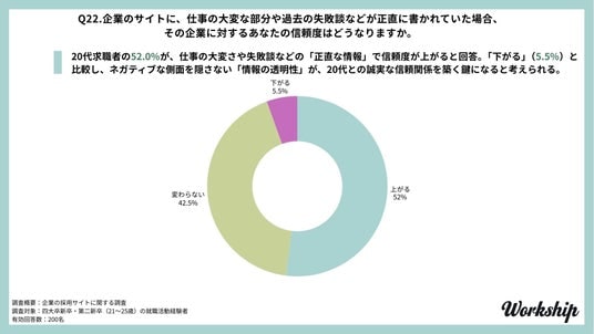 企業の採用サイトに、仕事の大変な部分や過去の失敗談が正直に記載されていた場合、52.0%が「企業に対する信頼度が上がる」と回答しました。