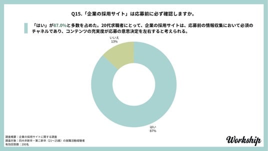 20代の求職者に「企業の採用サイトは応募前に必ず確認しますか」と尋ねたところ、87.0%が「はい」と回答しました。