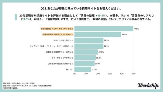 印象に残っている採用サイトの理由として、49.5%が「情報が整理されていてわかりやすかった」、39.5%が「社員の雰囲気や声がリアルに伝わった」ことを挙げています。