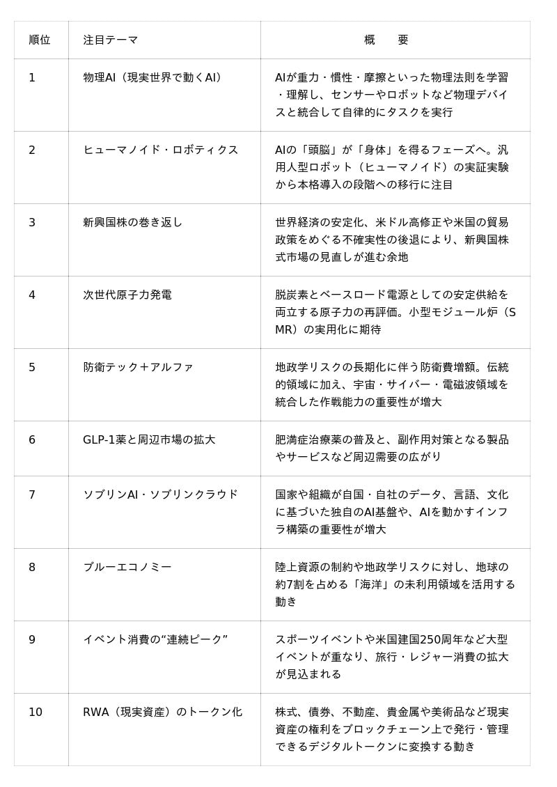 三井住友 DS アセットマネジメント株式会社(所在地:東京都港区、代表取締役社長 兼 CEO:荻原亘、以下「当社」)は、「2026年の注目投資テーマ Top10」を取りまとめましたので、お知らせします。