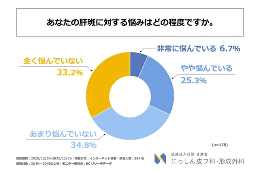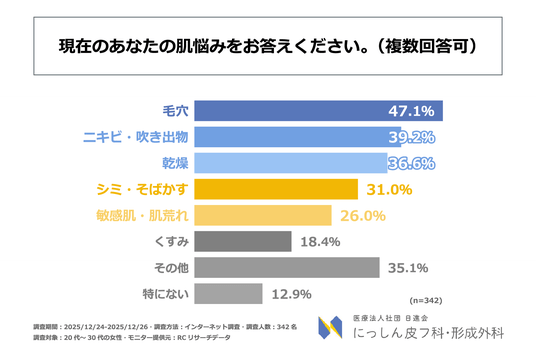 医療法人社団日進会 にっしん皮フ科・形成外科(所在地:埼玉県さいたま市、理事長:平岩 亮一)は、20代~30代の女性を対象に「20代~30代の女性のスキンケア習慣と肝斑への意識に関する調査」を実施しました。この調査から、20代~30代の女性が抱える肌の悩みや日々のスキンケア習慣、肝斑に対する認知度や悩みの実態などが明らかになりました。