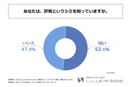 また、「肝斑というシミを知っているか」を尋ねる設問への回答では、「はい」が52.1%、「いいえ」が47.9%という結果になりました。この結果から、20代~30代の女性の約半数が、肝斑というシミを知らないことがわかりました。